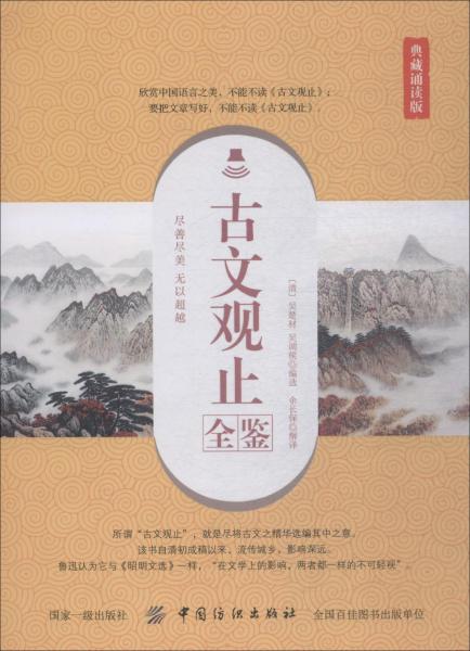 中国古代散文是中国传统文化宝库中的璀璨明珠,它们风格各异,美不胜收。《古文观止》所选文章上起先秦,下迄明末,大体反映了先秦至明末散文发展的主要面貌。该书分12卷,总计222篇,篇幅长短适中,篇目和分卷比较匀称,衡文标准兼顾思想性与艺术性的统一。本书《古文观止全鉴(典藏诵读版)》以时代为经,以历代作家作品为纬编排,并对每篇文章都进行了简要的评注,以辅助读者理解文义。另外,本书附赠