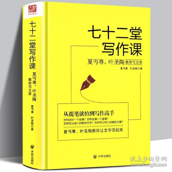 《七十二堂写作课》是夏D尊和叶圣陶合著的一部讲述文章作法的书籍。《七十二堂写作课》书中的文章均选自二人合编的《国文百八课》,,《七十二堂写作课》是一本侧重文章形式的书,所选取的文章虽也顾到内容的纯正和性质的变化,但文章的处置全从形式上着眼。全书一共七十二讲,几乎涵盖了所有的文章及文学体裁,记叙、说明、议论、应用,诗歌、小说、戏剧、散文,每一类别都有十分精到又浅显易懂的见解与指导