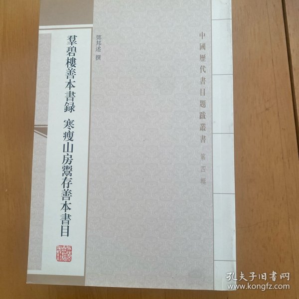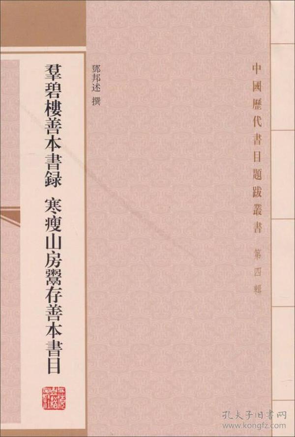 《中国历代书目题跋丛书(第四辑):群碧楼善本书录·寒瘦山房鬻存善本书目》包含《群碧楼善本书录》、《寒瘦山房鬻存善本书录》及"补遗",清末民初江南藏书家邓邦述所撰。《群碧楼善本书录》六卷,为民国十六年(1927)邓邦述向中央研究院历史语言研究所让售藏书时所编。《寒瘦山房鬻存善本书录》七卷,为邓邦述鬻书后,根据寓中遗存之书编成。均详记卷数、册数、作者、行款、藏书印,后缀邓氏题跋。各