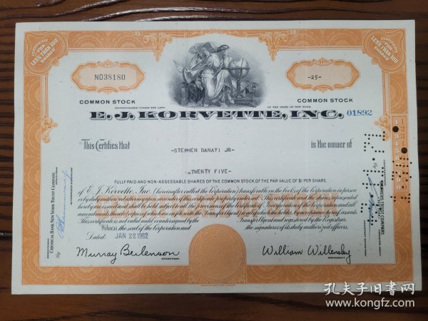 1962年E.J. Korvette公司的普通股股票证书, - 公司情况:依据纽约州法律成立。E.J. Korvette公司曾是美国一家知名的折扣零售商,在20世纪中期发展迅速,以提供种类丰富且价格实惠的商品而受到消费者欢迎, 对当时的零售行业格局有一定影响。不过后来在市场竞争等因素作用下,公司发展遭遇困境。 ​- 持股方:小斯蒂芬·巴纳伊(Stephen Banayi Jr)。