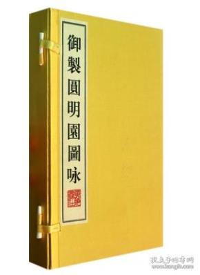 《御制圆明园图咏》清高宗弘历撰文,乾隆间内府刻本。《御制圆明园图咏》内容、体例均仿康熙皇帝《御制避暑山庄三十六景诗》一书,收录乾隆皇帝为圆明园景观所作的诗、词作品。全书共收录四十景,每一景绘图一幅,并有御制诗一首,诗中夹注;诗题后有小序,对景点作简介。《御制圆明园图咏》全书体例严谨,写、刻、绘俱精,是典型的内府刻本。,《御制圆明园图咏》共分上下两卷,每卷收二十景。卷首有《世宗憲