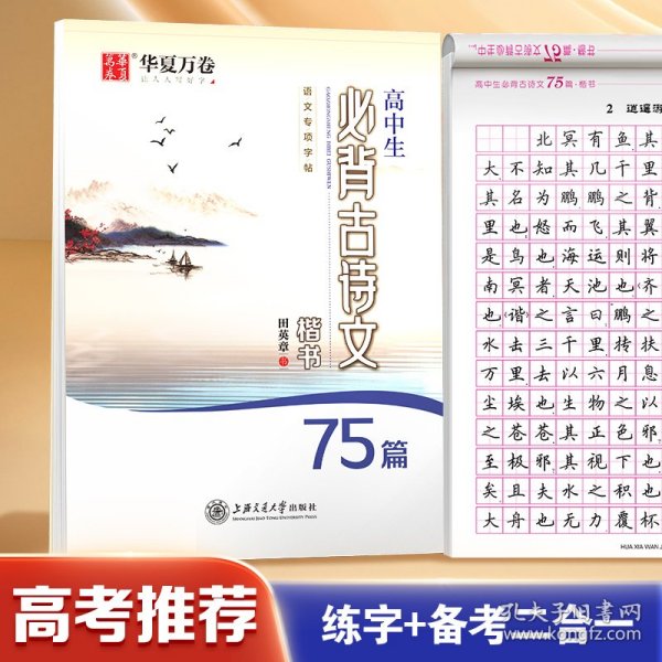 《高中生必背古诗文75篇(楷书)》为高中教辅类语文字帖,内容来自高考考纲古诗文背诵篇目,包括高中14篇和初中的61篇。高考中的默写题都出自这些篇目。学生使用本练字帖,在练好字的同时,也易于记忆成诵。